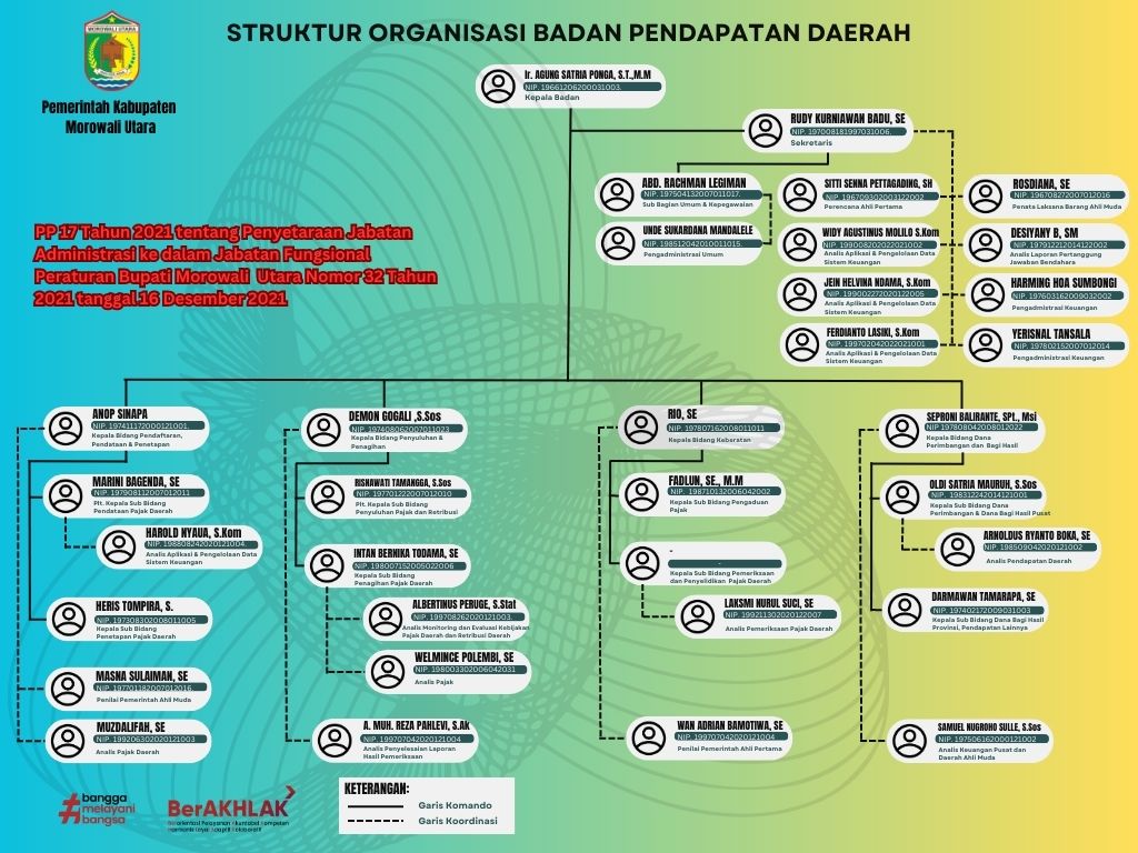 Berikut Susunan Organisasi Badan Pendapatan Daerah Sesuai dengan peraturan Bupati Morowali Utara Nomor 12 tahun 2019: